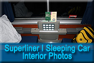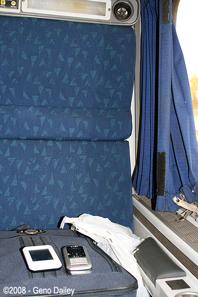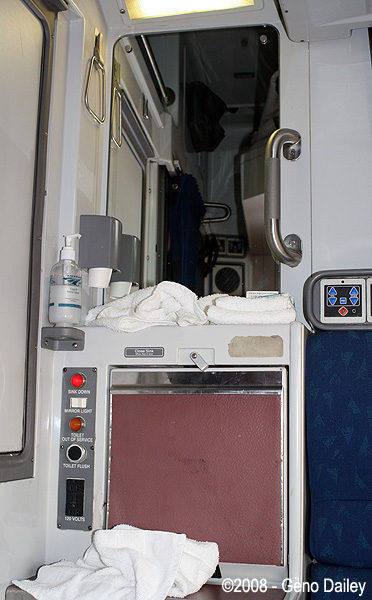 LEFT: The sink that folds out from the wall, the "table" the towel at the bottom of the photo is sitting on is the cover for the toilet. RIGHT: One of the 2 seats when set up for day travel. Funny, that Palm Pilot broke at some point on the trip and that cell phone and suitcase made their final Amtrak journey on this trip before being retired! For more Viewliner interior photos, check out my photos taken in during my trip in September 2003 on Amtrak's Northeast Corridor. Just make sure to use your browser's "BACK" button to get back to this page.