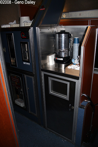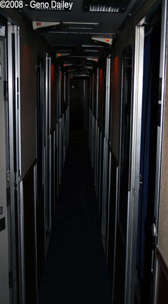 LEFT: The hallway with roomettes on each side. RIGHT: The coffee machine and water facilities. |