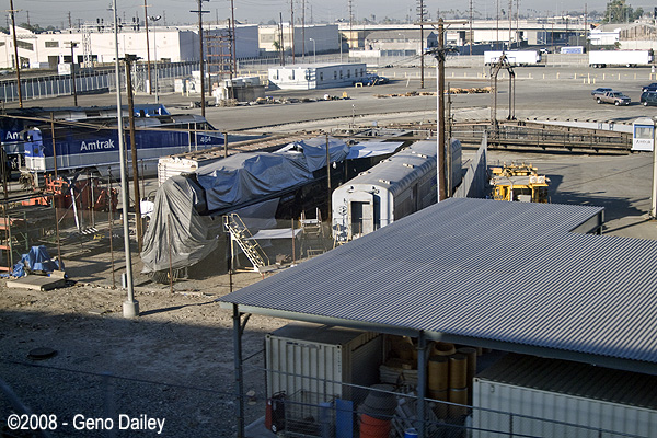 The roundhouse at Redondo Junction with some Amtrak power resting and underneath that gray tarp is