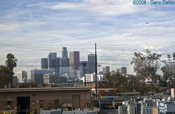 One final wide view of the Redondo roundhouse with the Los Angeles skyline in the background. |