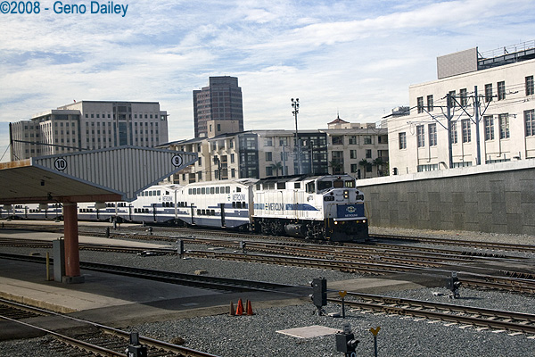 A Metrolink commuter train departing Union Station as we arrive. |