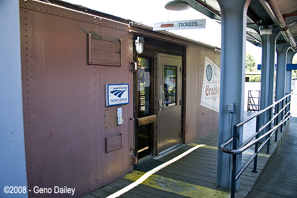 The Amtrak ticket office in the station, built inside a box car!!! |