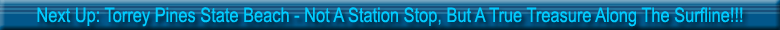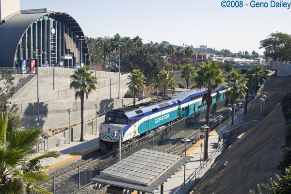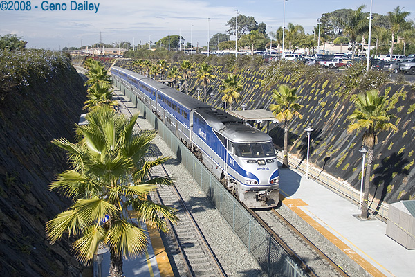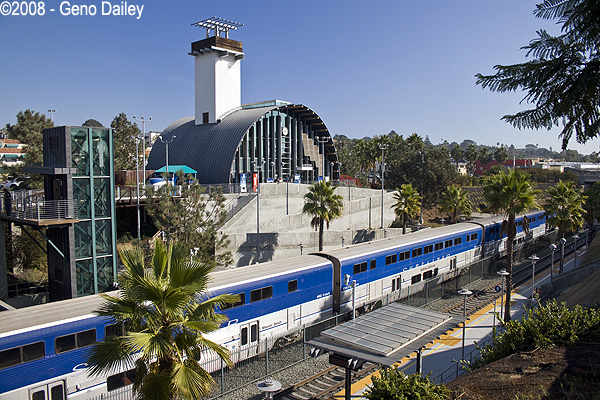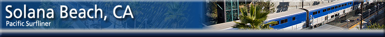 The Amtrak station in Solana Beach with a Coaster commuter train sitting at the station.