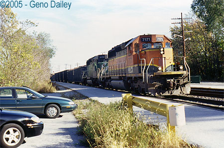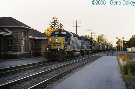 CSX Train Q-393 with an HLCX Lease unit (EX-BNSF SD40-2 #7171) on the lead is the first train of the day at 2:34pm. This train is on the CSX Ex-B&O mainline that is now the "New Chicago Line" that was double-tracked a few years ago to accommodate CSX's takeover of their share of Conrail. All freights that run the original Chicago Line that stay in CSX's territory will run on this line to Chicago. |