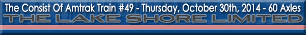 I would pass the time away checking out some stuff on the internet and playing some Sudoku puzzles on my phone. At 1:58am, running 2 hours and 3 minutes late, Amtrak Train #49 - The Lake Shore Limited arrived at Buffalo-Depew Station. Prior to the train's arrival, my ticket was scanned by the assistant conductor who would board the train when it arrives as this station is a crew-change point for the train. Upon arrival, the train receives a new engineer and conductors who take the train as far as Toledo, OH where another crew will then take it to Chicago. I would be seated in Amfleet II Coach #25039 in window seat #7 and would not nave a passenger sitting next to me once we departed. The consist for tonight's train is shown below: |