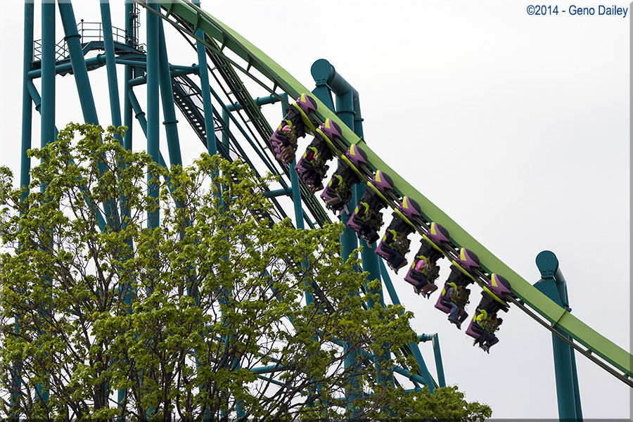 | Hiding behind the tree on Opening Day 2014 is Raptor heading down its first drop from the lift hill! |