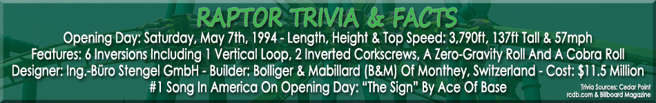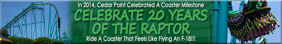 In 2014, Cedar Point celebrated the 20th Anniversary of the Raptor roller coaster. This ride is located in the front of the park along the main midway and features a total of six inversions! I can still remember waiting 2 1/2 hours to ride it in 1994 during its first season, and the wait was worth every minute! This ride is just plain awesome, even after 20 years! It's builder, Bolliger & Mabillard has now built a total of three coasters for Cedar Point, with this one being the first and the other two being Mantis and GateKeeper. Included here are photos taken over the years of this world class coaster along with some interesting trivia about the ride! Enjoy...