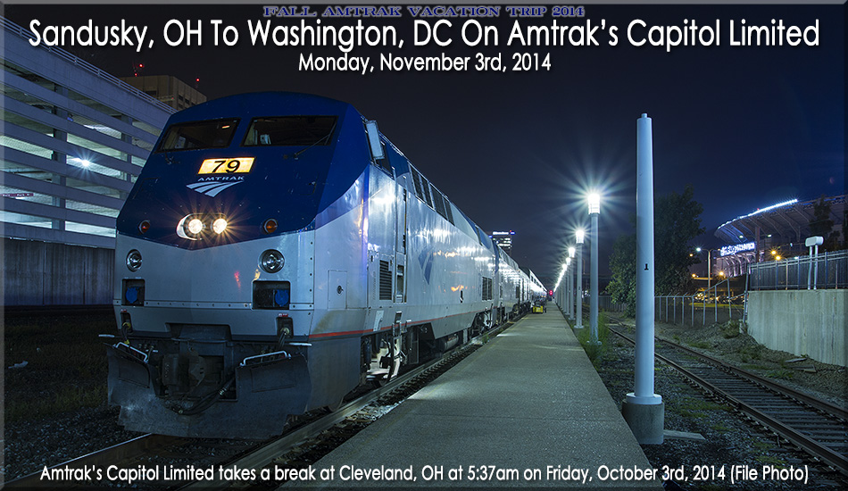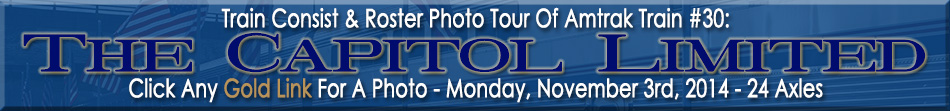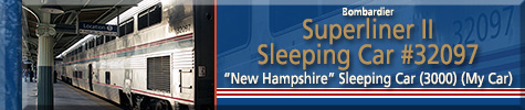 | After dropping off the rental car, and eventually getting a taxi to the Amtrak Station, I would arrive at the station around 12:30am, a good hour before the train did! Due to severe freight delays from host railroad Norfolk Southern, the Capitol Limited was known for getting to its endpoints severely late. In an attempt to be ready for this, Amtrak truncated the train to just five cars, powered by one engine. This allowed them to free up enough equipment for a backup 4th train set in case one of the trains arrives 12 hours late, there would be a train set available in Chicago if the late one can't be turned in time. Unfortunately, this meant that the train now has no Transition Sleeper which means valuable rooms in one of the two remaining Sleeping Cars are being used by the crew. Also, the Dining Car and Sightseer Lounge are being substituted with a Superliner Diner/Lounge Car with one side serving as the Diner and the other as the Lounge. If you ask me, this train really needs the Sightseer Lounge as it's a very scenic route overall! Today's shortened consist would feature 1 engine, 2 Sleeping Cars, a Diner/Lounge and 2 Coaches, one of which was a Coach/Baggage that was being used for checked baggage service since there also was no Baggage Car. No, I wasn't happy about having no lounge car on the train but I'm glad to see Amtrak was trying to do whatever they could to keep the train running at all, both because it serves two huge markets and I would need to ride it a total of two times on this trip! The consist for today's train is shown below... |