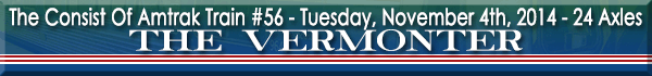 | I would start the day making the same trip back to Washington Union Station that I made the previous day. So at 5:00am, I had the hotel shuttle bring me back to Dulles Airport where I caught the Washington Flyer bus back to the Wiehle-Reston East Metro Rail Station on the Silver Line and would make about an hour-long trek on the Metro Rail, switching to the Red Line at Metro Center Station, then taking that a few stops to Union Station. I would have a quick breakfast at McDonald's before heading over to Gate K as my train that would be taking me to New York was going to board on Track #27. I would ride Amtrak Train #56 - The Vermonter which is actually a state-sponsored train that begins its route on the Northeast Corridor at Washington, DC and runs all the way to St. Albans, VT. This train years ago was known as the Montrealer as it ran all the way to Montreal. I have heard there is a push to get it back there again someday. Union Station does its boarding calls by first boarding Business Class, then passengers with disabilities, then families with small children, then the rest of us, myself included. Our tickets would be checked by a member of the crew before walking downstairs and outside to the platform where the train was waiting for us. I would take down car numbers as I walked up the platform and get a few quick photos. The consist for today's train is shown below: |