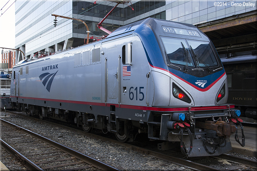 | I took some roster photos on the platform shortly before departing Washington, DC. Parked on a nearby track is ACS-64 #615. These units are currently being built by Siemens in Sacramento, CA and are replacements for the AEM-7's. Amtrak will be getting a total of 70 of these electric units. |