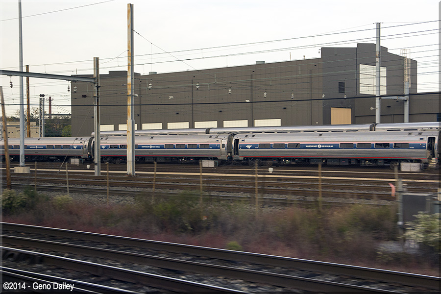 | Some Amfleet I equipment with some Superliners hidden behind, at Ivy City. |