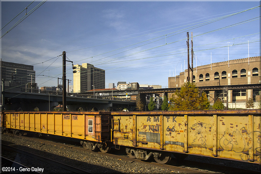 | Coming into Philadelphia, PA. Amtrak had a work train in the area and the stadium in background to the right of the photo is Franklin Field which is part of the University Of Pennsylvania. |
