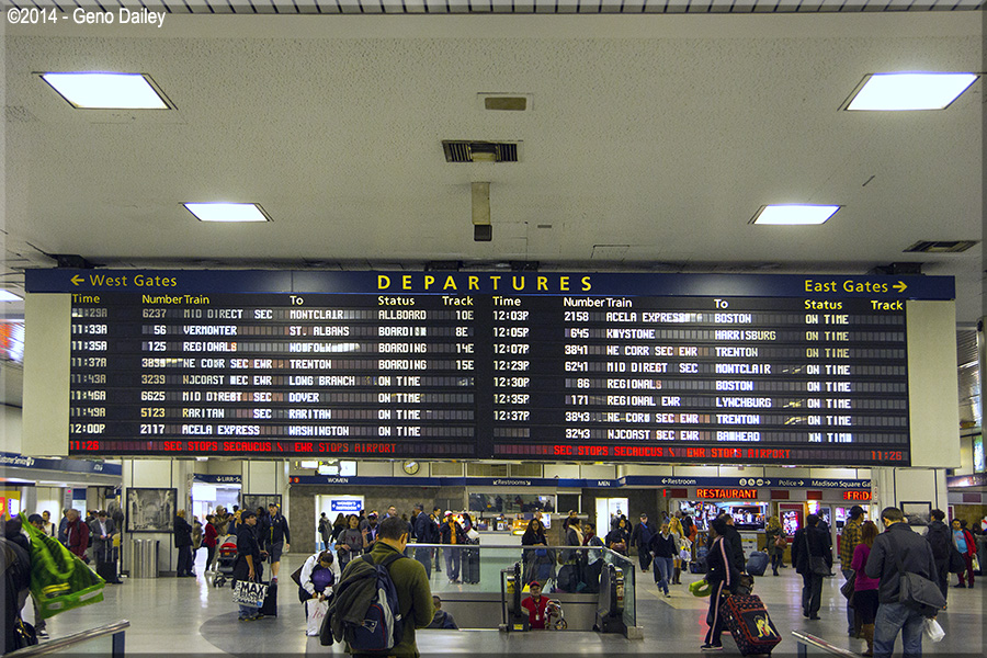 | A wide-angle view of the Departure Board at New York Penn Station, this is one busy place!!! |