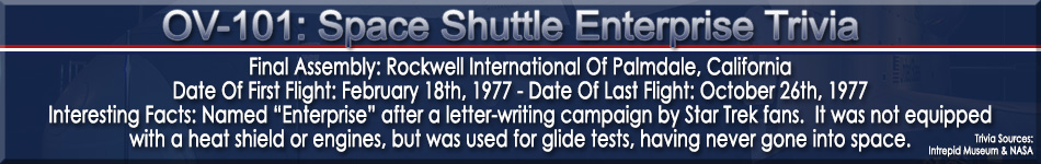 Space Shuttle Enterprise (designated as OV-101, or Orbiter Vehicle 101) was built as a test shuttle with no engines and no heat shield so there was no way it could actually go into space. It was also named "Enterprise" after a very serious letter-writing campaign started by fans of the TV show "Star Trek", who wanted it named after the "Starship Enterprise". According to NASA, it was used to test the critical phases of landing and other aspects of shuttle preparations. For these tests, it was brought in the air atop a modified Boeing 747, and was released over a dry lake bed at Edwards Air Force Base in California to prove it could glide and land safely.