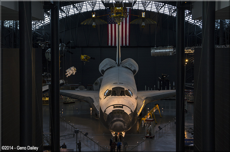 | An overhead view of the shuttle from inside the main hangar at the Steven F. Udvar-Hazy Center. |