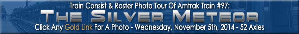 I was ticketed in the "9710" car in Roomette #1. My sleeping car attendant was excellent and directed me to my room. I found out right away, this was gonna be a different experience than using a Superliner Roomette which is what I'm used to. For now, I just put both bags in the room and went back outside to the platform for a few pictures before we departed as well as to watch the engine change. I'll get into details on the room itself in a little bit. I walked down to the head end and could see the two P42's that would be added to the train that would take us to Florida. Once the power was connected, I walked back to my sleeping car which was located next to the diner. I looked on this web site (yes, I use my own site for reference!) to get the history of the Dining Car on the train which was Heritage Diner #8532, a former Chicago, Burlington & Quincy Railroad Coach named "Silver Halter" that was later converted to a Dining Car by Amtrak. It had the full Timoinsa Interior and even had pocket doors installed on each end. The car was beautiful and I was glad we had it on this train as these are my favorite cars on Amtrak. The all-aboard signal was given and finally, at 8:25pm, now 55 minutes late, we finally departed Washington Union Station. The consist and roster photo tour for tonight's train are shown below: |