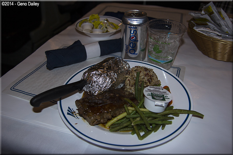 Time for dinner!!! I would have the Amtrak Signature Steak with a baked potato, three grain rice pilaf and mixed vegetables. I'll remember that steak