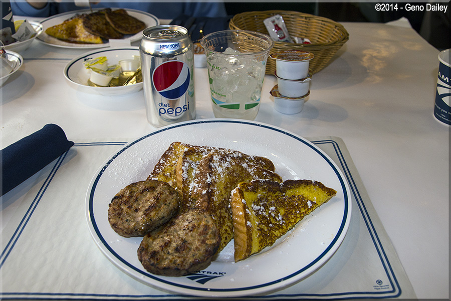 | Time for breakfast the next morning! Here is the Railroad French Toast with chicken apple sausage patties and a Diet Pepsi, good eats!!! |