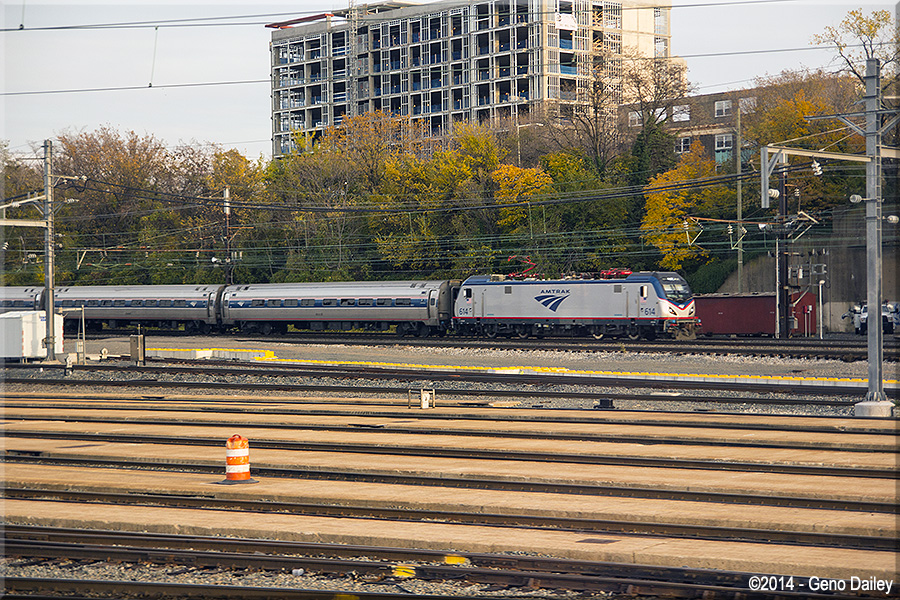 Amtrak Northeast Regional Train #145 arriving in Washington as our train heads west away from the corridor. Train #145 has ACS-64 #614
