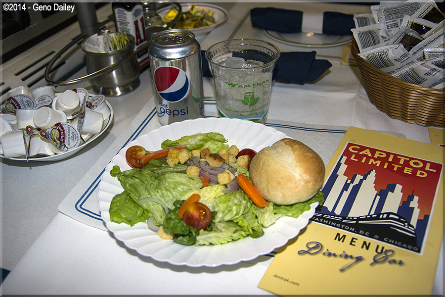 It's dinner time on the Capitol Limited! Here we have the side salad, Amtrak's new and improved side salad to be exact!