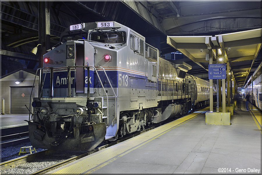 | GE P32-8BWH #513, still in Phase IV paint is the power for tomorrow's Train #42 - The Pennsylvanian which runs between here and New York Penn Station. |