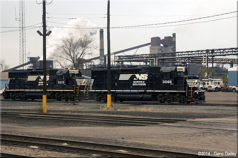 | A couple Norfolk Southern EMD GP40-2's near one of the many steel mills you'll pass here in northwest Indiana! |