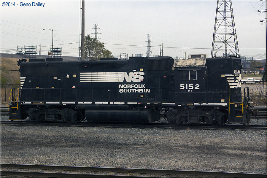 | Norfolk Southern EMD GP38-2 #5152, a high-hood version of this workhorse road switcher, at Gary, IN. |