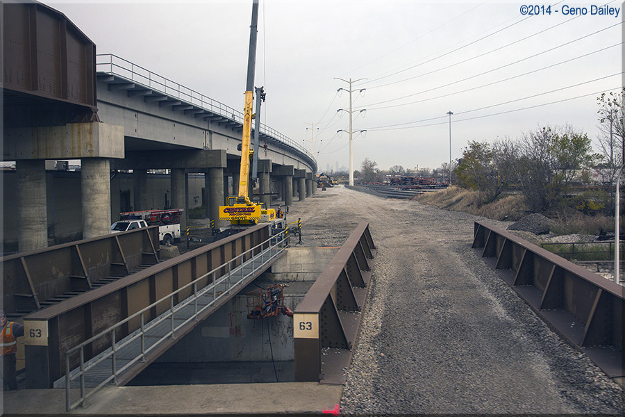 | The new Englewood Flyover (bridge to the left) which replaces the diamond with the Metra Rock Island District that used to cross the main line here. |