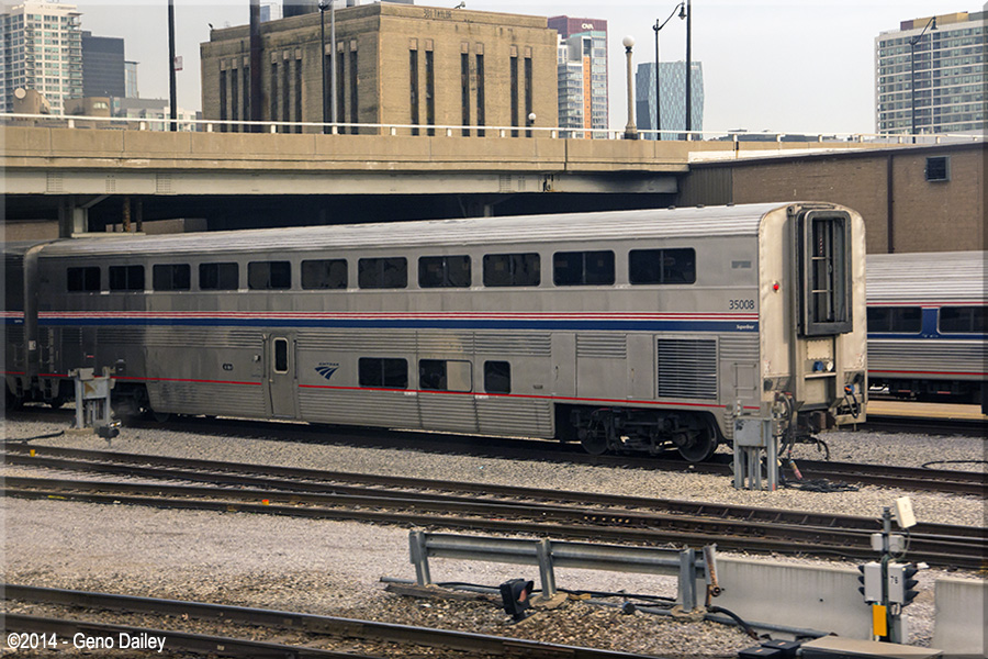 Superliner I Snack Coach #35008 in the coach yards. The overpass in the background is Roosevelt Road, which is my next destination
