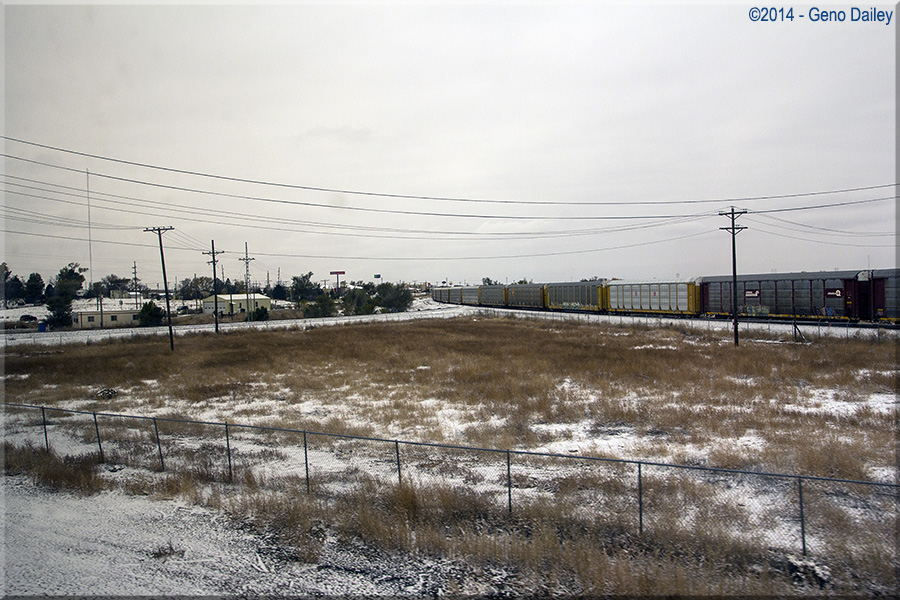 | Now taking a break at La Junta, CO. At some point along the route, that piece of tumbleweed hitched a ride on the snowplow of our lead unit! |