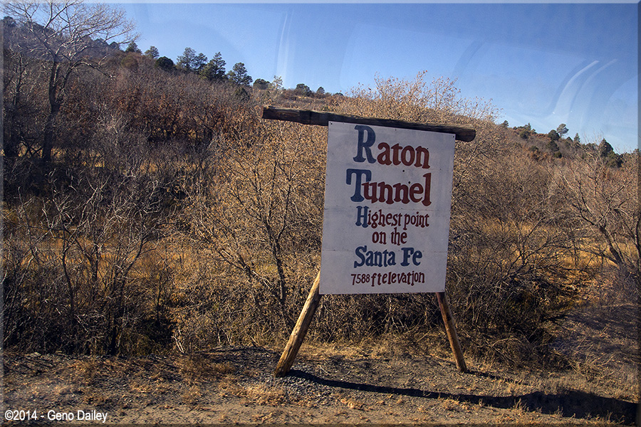 | The sign says it all! We've reached the top, so to speak! The Raton Tunnel represents the highest point on the old Santa Fe Railway at 7588ft! |