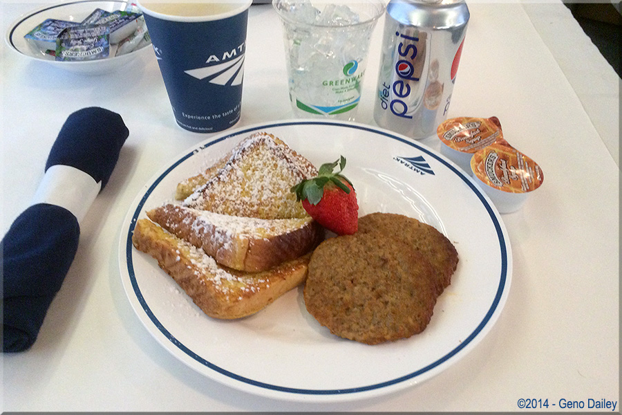| Now time for breakfast on the Southwest Chief! The Railroad French Toast with pork sausage patties and a Diet Pepsi, more good eats!!! |