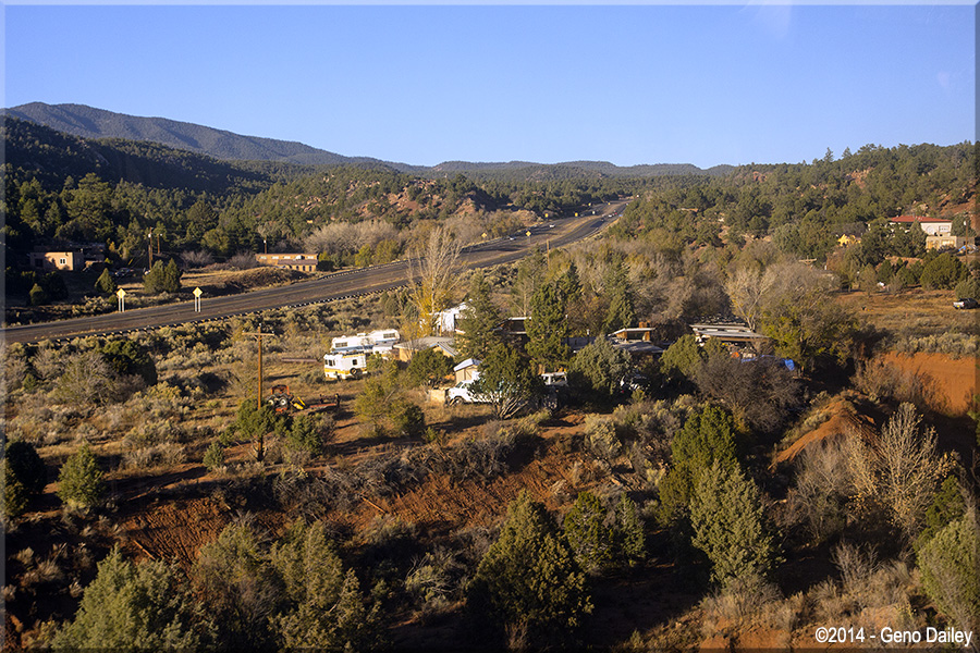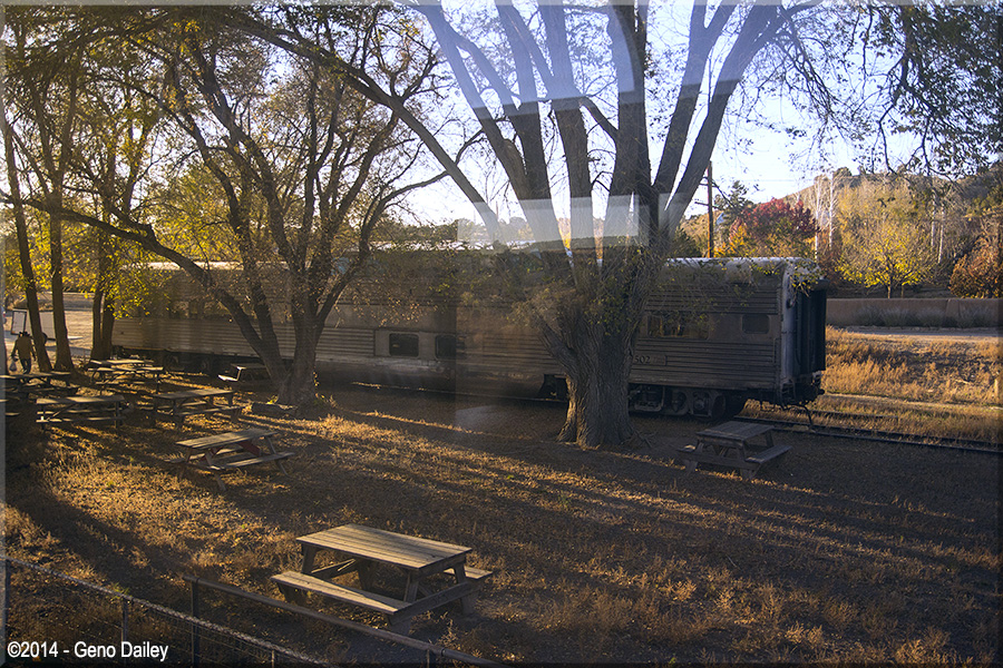 | Former Santa Fe Super Chief Dome Car "Plaza Lamy" is parked at the Lamy Station, and in this photo, carefully hidden behind those trees! |