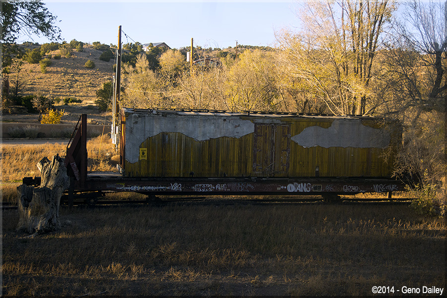 | Next to the station at Lamy, we have a reefer car, sitting on a bulkhead flat car with no trucks! |