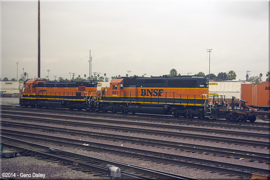 | Some BNSF power at San Bernardino including NRE 3GS21B-DE #1310 and EMD SD40-2 #1881. |