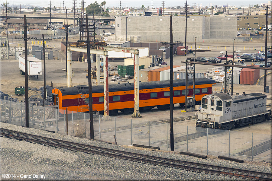 | Now going past the Redondo Roundhouse area, we see Former Milwaukee Road Private Car "Montana" along with Amtrak EMD SW1000R #795 Switcher. |
