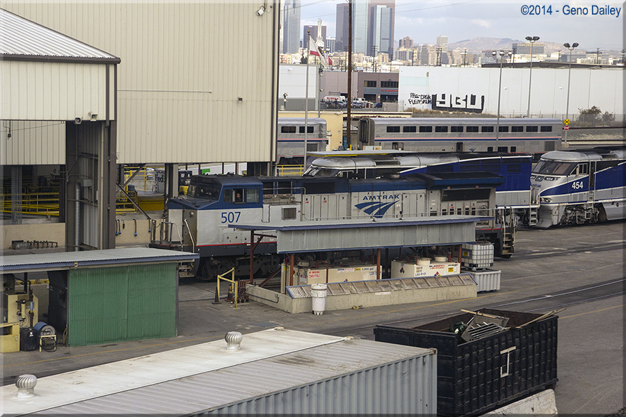 | Now passing Amtrak's 8th Street Yard & Shops. Here we have GE P32-8BWH #507 at the shops in front of a couple EMD F59PHI's. |