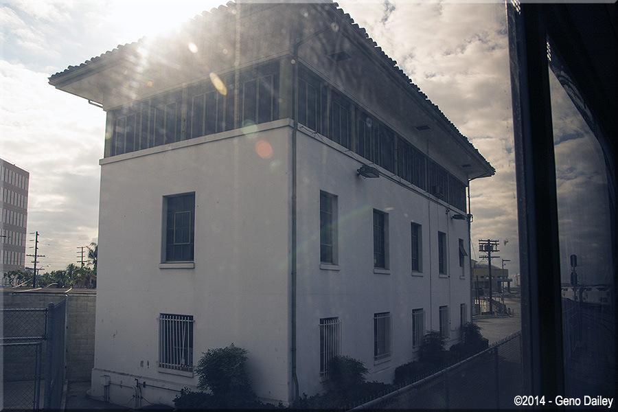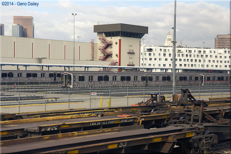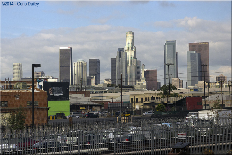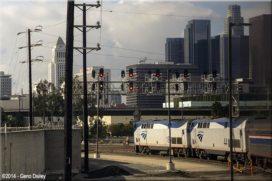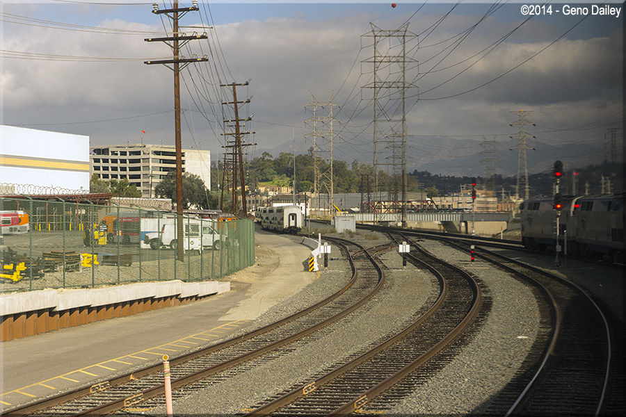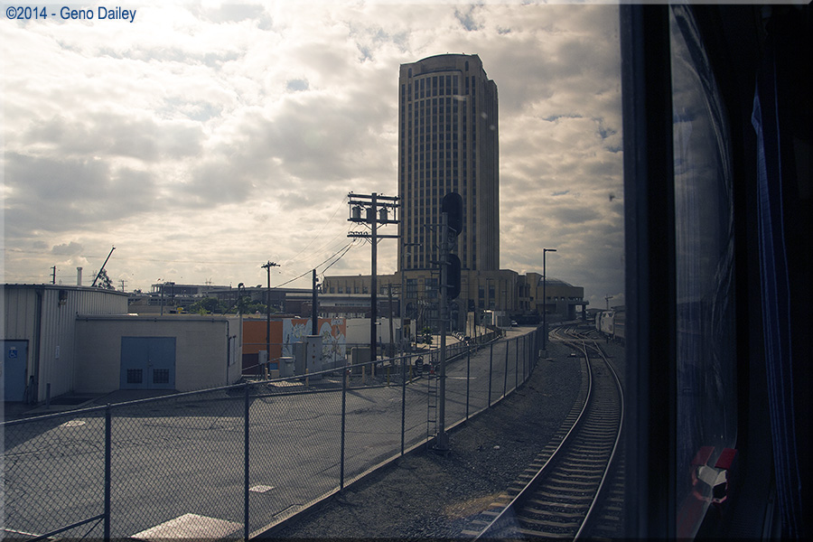 | Now entering the platforms at Union Station, the tall building in the center of the photo is the Los Angeles Metropolitan Transportation Authority Building which is located across the tracks from the station. |