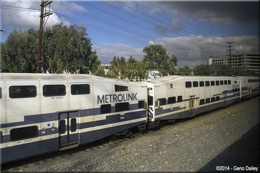 | Passing some older Metrolink Commuter Coaches just outside Union Station. |
