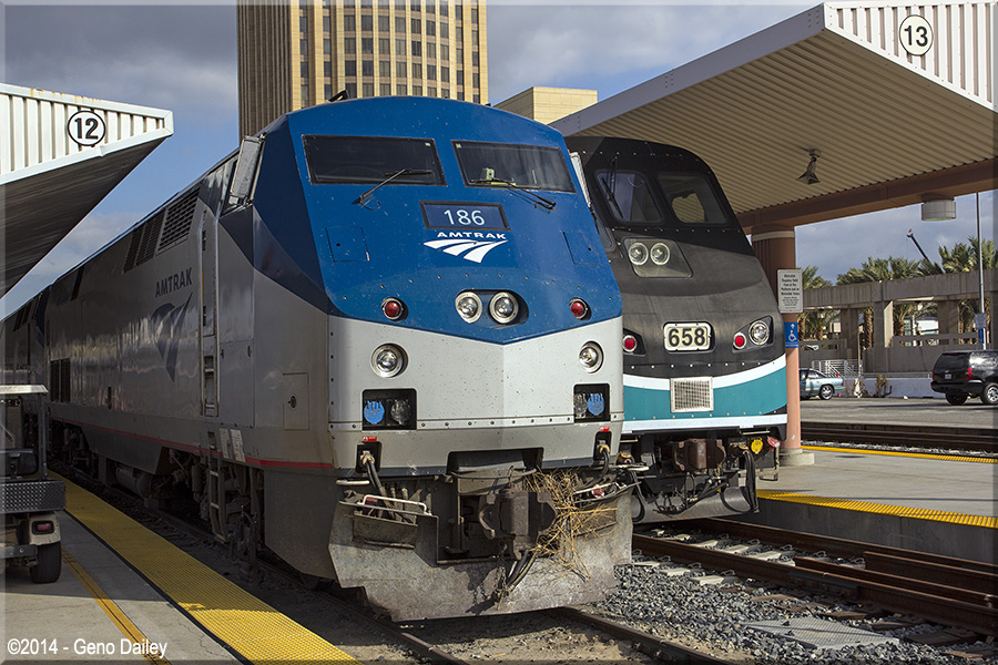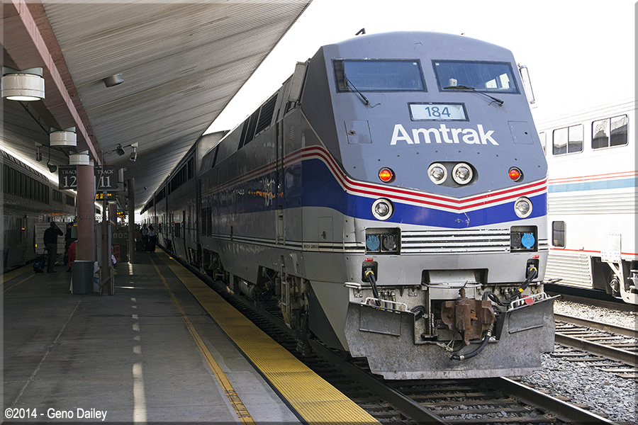 | This Pacific Surfliner train had GE P42DC #184 for power which is painted up in Amtrak's Phase IV paint scheme from its 40th Anniversary back in 2011. |