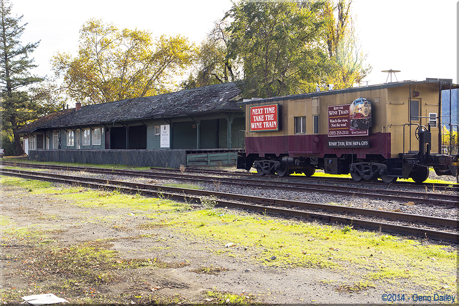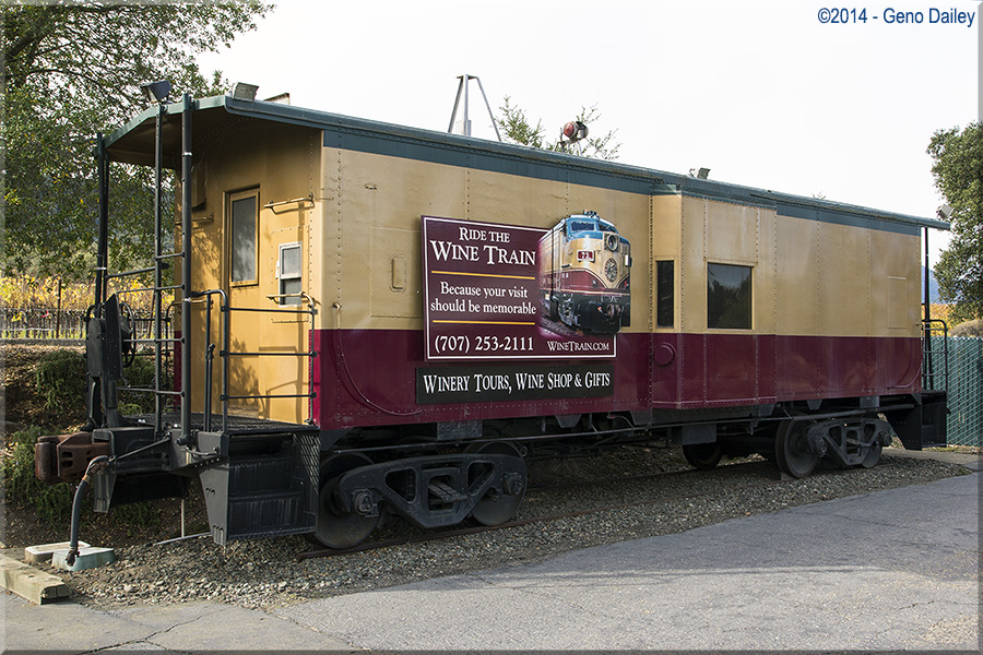 | One of the cabooses that double as a billboard for the Wine Train, this one at the station in Yountville. This caboose is of Southern Pacific heritage. |