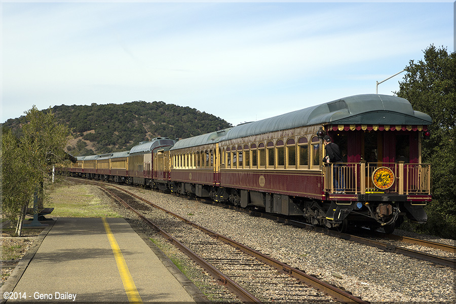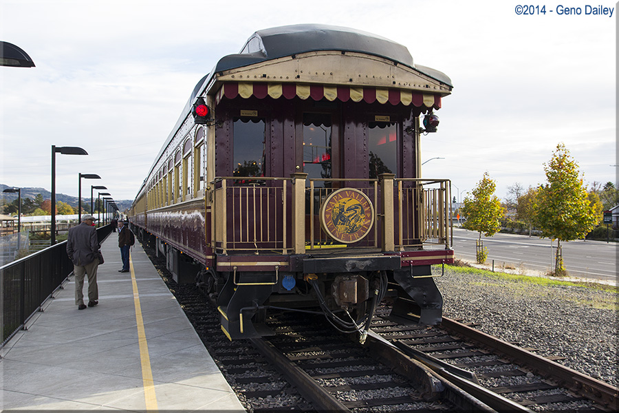 | The Cabernet Sauvignon Lounge/Platform Car brings up the markers on today's train as it heads past the Yountville Station. |