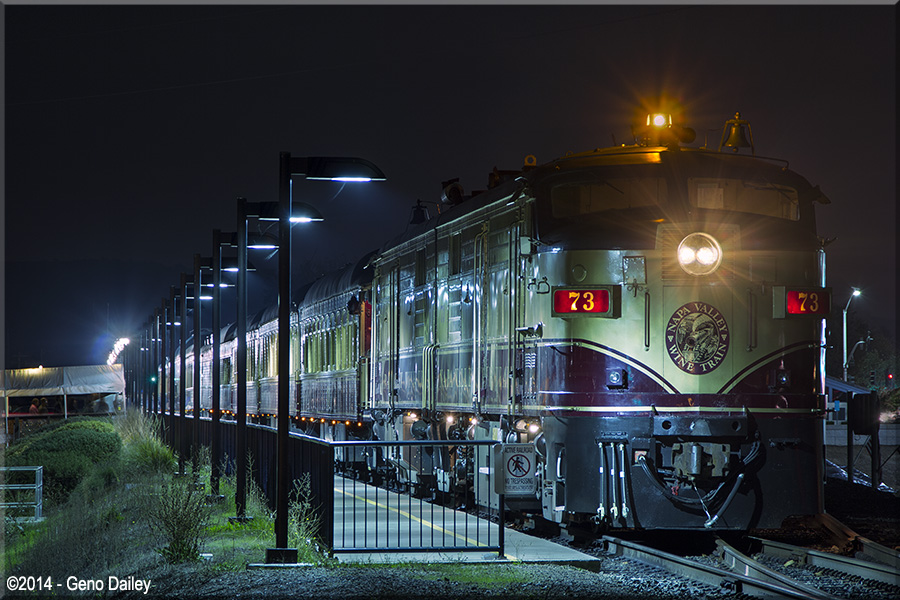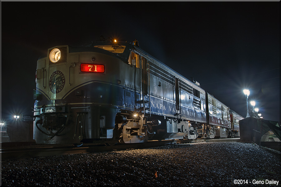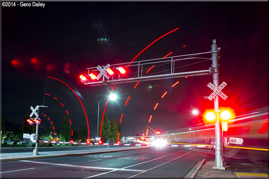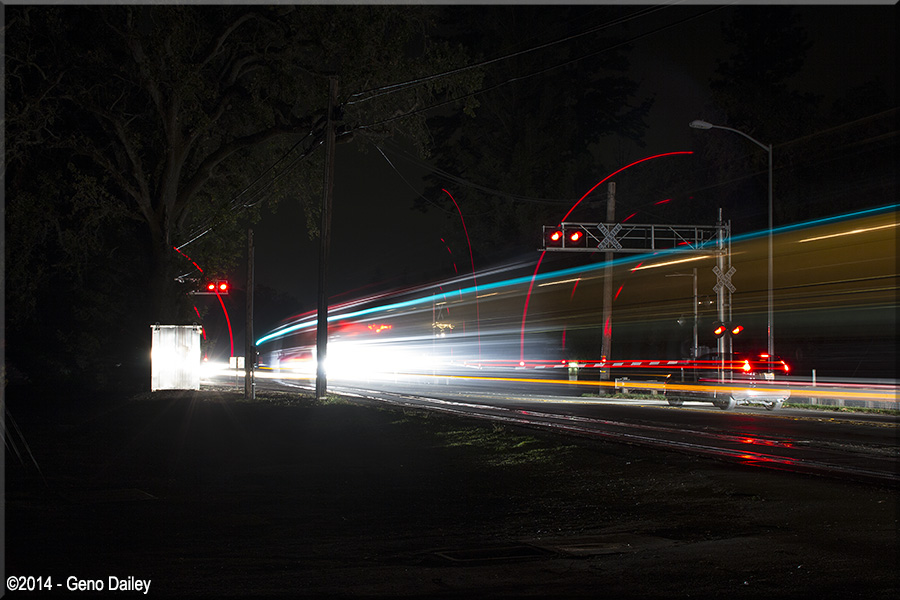 | This is just a regular time exposure, but it shows the train going through the crossing at Soscol Avenue shortly after departing Napa Station. |