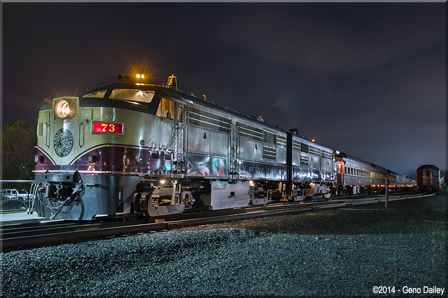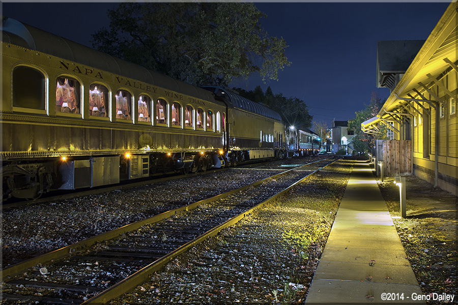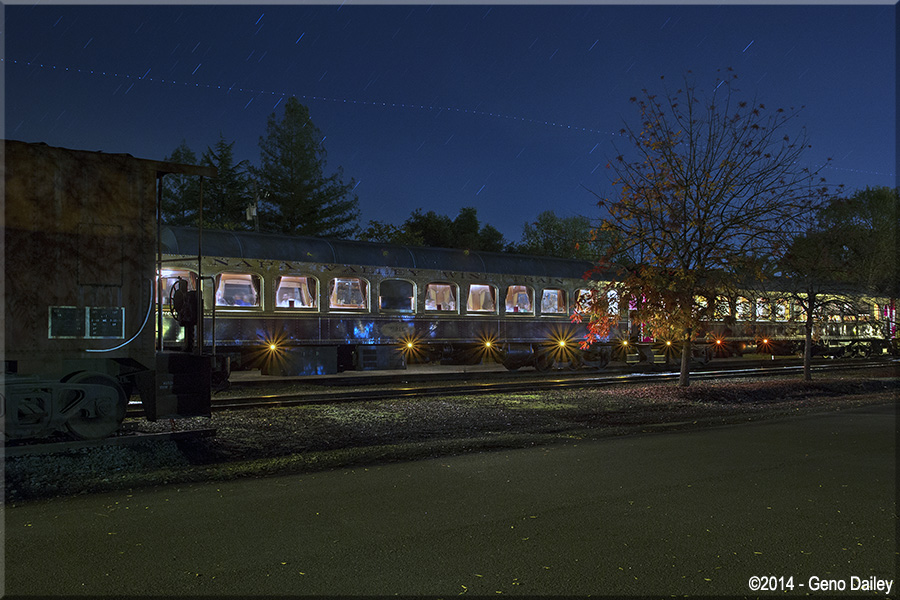 | As I'm sure you know, one of my favorite kinds of photography is definitely night photography. I made it a point to do as many night photos as I could on the two nights the railroad was running a dinner train. What you're about to see here are photos of a world class train after the sun sets! This type of photography always presents an excellent challenge for me to try to work with whatever available light I have to come up with something really cool! Most of the photos you'll see here were of the "Manual HDR" variety, meaning there was a fair amount of processing done in Adobe Photoshop to get the end result. Now why do I do this? Very simple actually, with a Manual HDR photo, you can create a photo that will look more the way your eyes would see the object at night! I taught myself this technique over the past 4 years doing night photos of Amtrak. I do hope you like what you see here! Enjoy... |