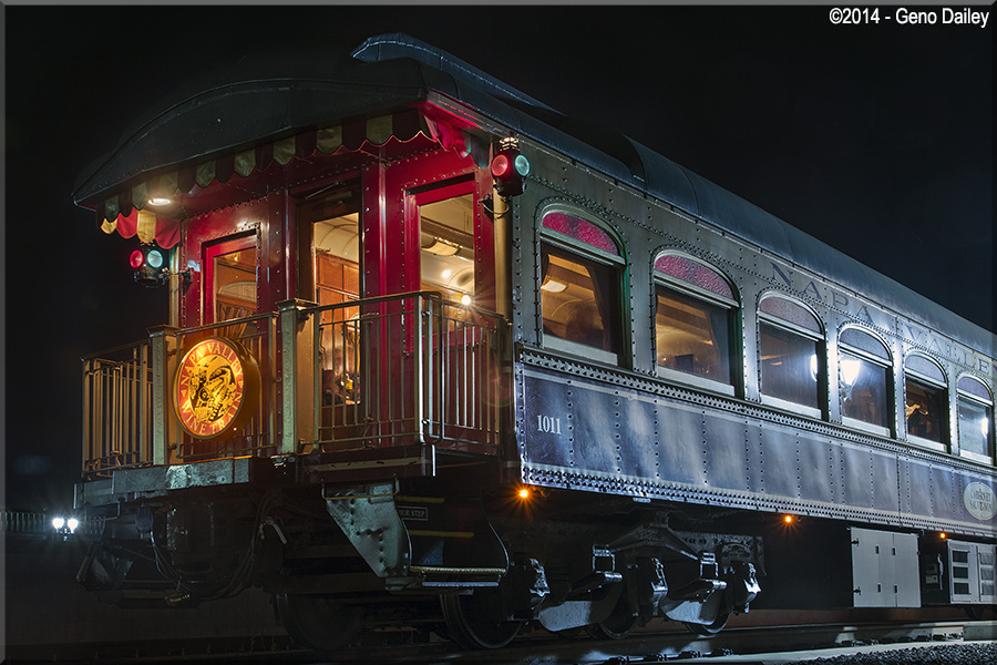 | A "profile" view of the end of the Cabernet Sauvignon Lounge/Platform car before departure from Napa. |