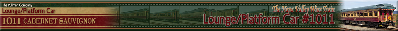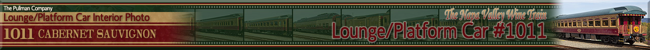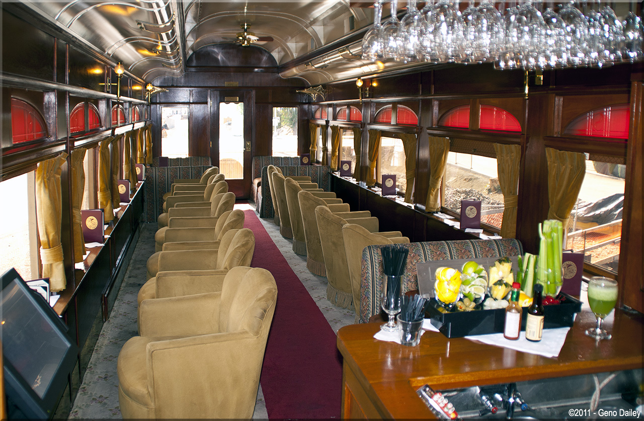 Just like its counterpart "Chardonnay", this lounge car features the same comfortable chairs and large windows, making it a great place for some fine wine while riding through Napa Valley! Historical information about this car provided by the Napa Valley Wine Train. |