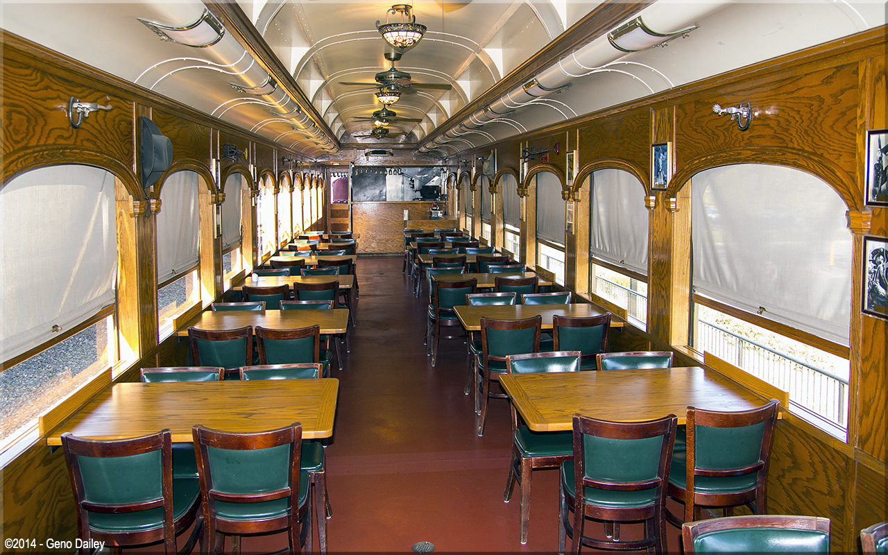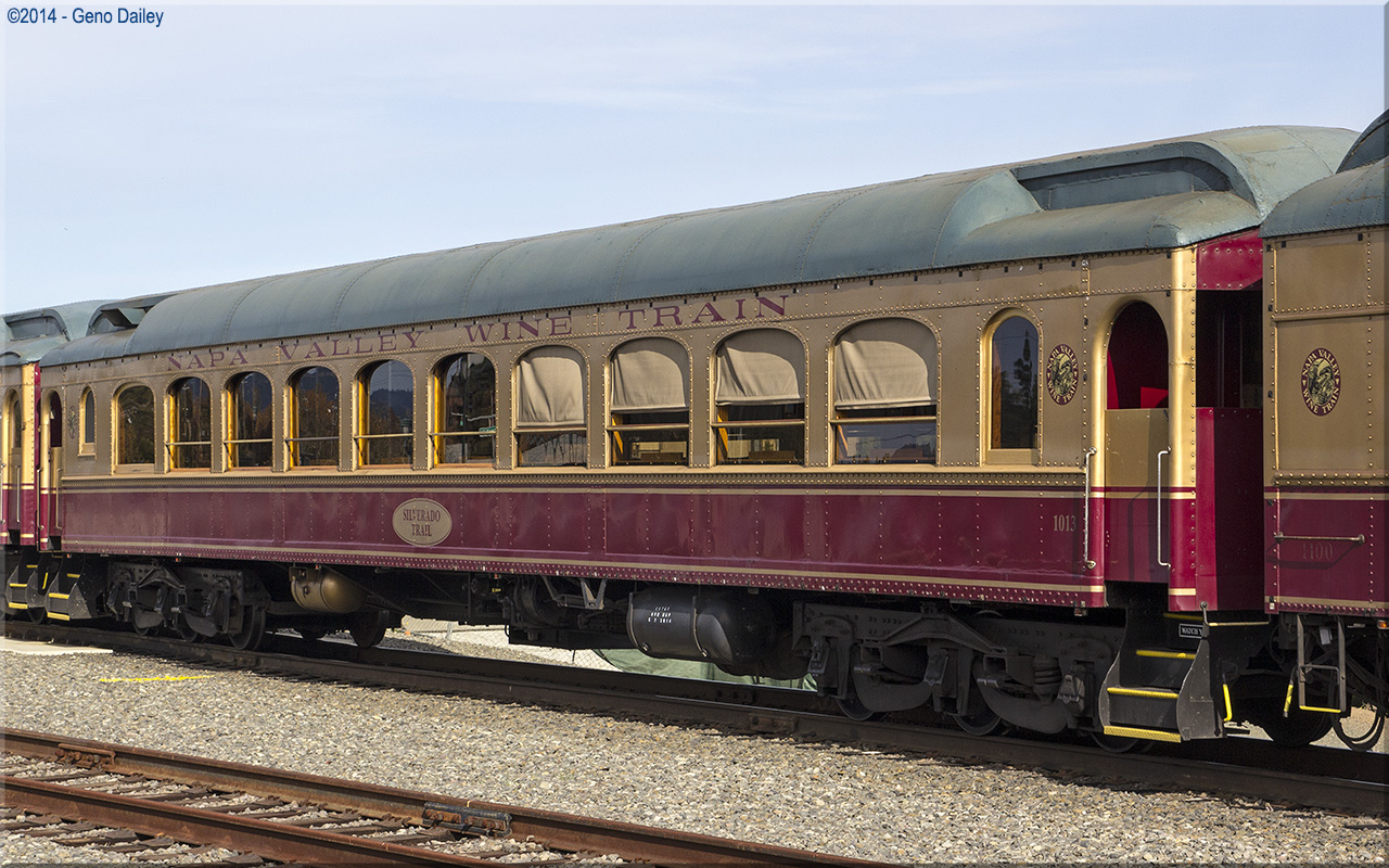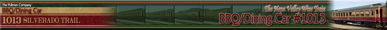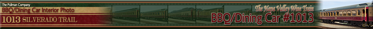 Originally built as a Coach, this car operated as Northern Pacific #1225. It also operated as part of the Denver Ski Train from 1960 to 1987 before being acquired by the Wine Train. This Western-themed car features open windows and operates on a seasonal basis on the Wine Train and features its own kitchen which provides meal service specifically for passengers in this car. Historical information about this car provided by the Napa Valley Wine Train. |