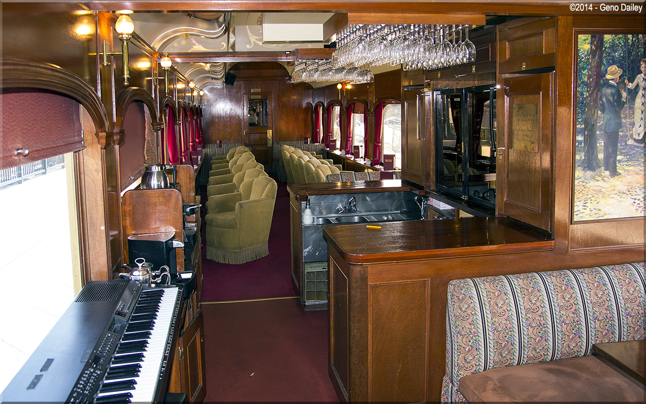 A great place for dessert and a glass of wine! A wine tasting bar is featured in this car along with a music keyboard for "onboard musical entertainment"! Historical information about this car provided by the Napa Valley Wine Train. |