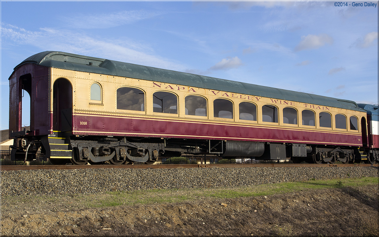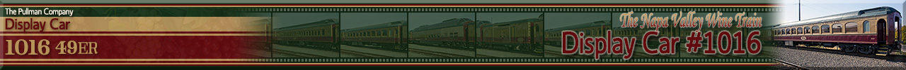 Set up outside the Wine Train's Napa Station, this car served on the Denver Ski Train before being purchased by the Wine Train. Numbered 1016 and named "49er", it has undergone a structural restoration and is used as a Display Car. Historical information about this car provided by the Napa Valley Wine Train. |