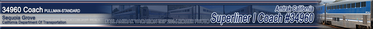 Built in 1979 as a 74 seat Coach. Converted to a Smoker Coach with an enclosed, ventilated smoking lounge on the lower level of the car in place of the lower-level Coach seating in January 1999 and renumbered 31592. Car was wrecked in April 2004 and in October 2008, was repaired and converted back to a regular coach using funds provided by the California Department Of Transportation and renumbered 34960. Historical information about this car provided by www.amtrakbythenumbers.com and Dan Ainsworth's Amtrak Superliner pages. |